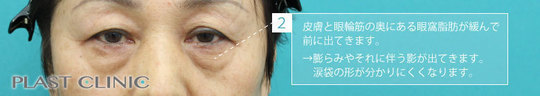 せり出した眼窩脂肪は皮膚や眼輪筋を押し出すため、なお一層①の皮膚や眼輪筋が緩んでしまいます。
